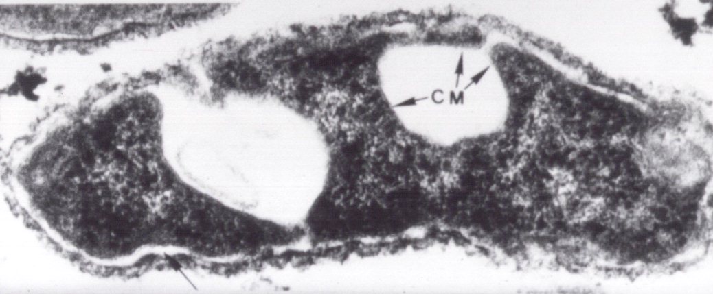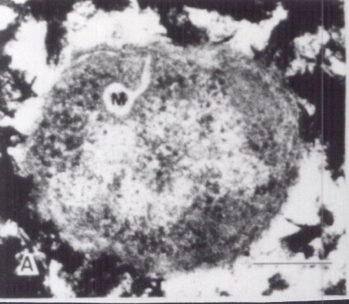 Figure A: Hydrocarbon constituents being engorged by a bacterial cell. The engorged material will eventually form an inclusion known as a mesosome (M). This photo shows the uptake of the oil. Note the indention of the bacterial membrane (in the upper left) where oil is being taken into the cell's interior.