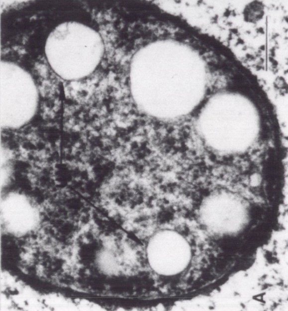 Figure C: Hydrocarbon droplets have been completely engorged by this cell. Each droplet is encased by a single membrane structure, known as an ultramembrane (UM). The droplets will be converted by the bacterium to fatty acids which later will be converted to energy to sustain the bacterium.