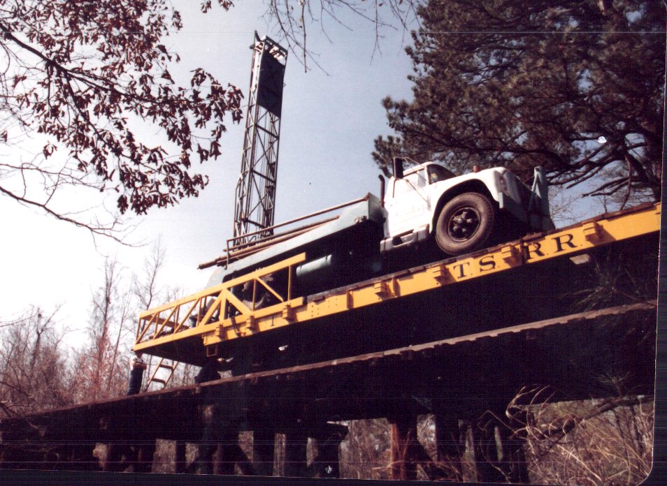 An ETTL drilling rig atop a flat car drills down between ties of a bridge supported by creosoted wooden pilings at the Texas State Railroad