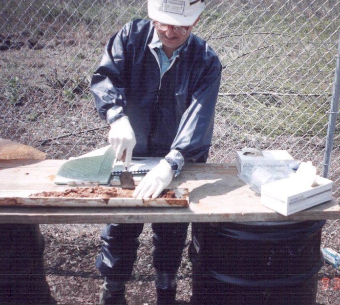 At right, a sample taken from a hazardous site is prepared for transport to ETTL's analytical laboratory.