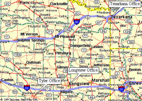 This regional map shows the city locations of ETTL's offices. You'll find links to detailed Tyler, Longview and Texarkana maps just below this map, as well as a link to the same maps in black and white, in case you don't have a color printer.