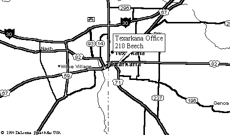 If you enter Texarkana from the east on either Hiway 67 or 82, you'll find that these roads merge in town, then, 6 or 7 blocks later, they angle to the left on E. 8th Street where Pecan Street crosses it. Go one block on E. 8th, turn left on Beech Street, and proceed to the office.