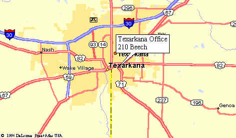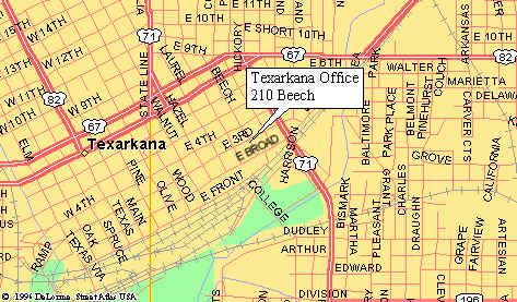 If you enter Texarkana from the east on either Hiway 67 or 82, you'll find that these roads merge in town, then, 6 or 7 blocks later, they angle to the left on E. 8th Street where Pecan Street crosses it. Go one block on E. 8th, turn left on Beech Street, and proceed to the office.