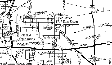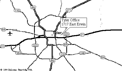 If you come to Tyler from the north on Hiway 69, turn left when you reach Loop 323 (there's a Day's Inn at the Intersection) and follow the Loop for a total of 6.6 miles till you reach East Erwin, where you'll turn right and go 1/2 mile to the office. (Th